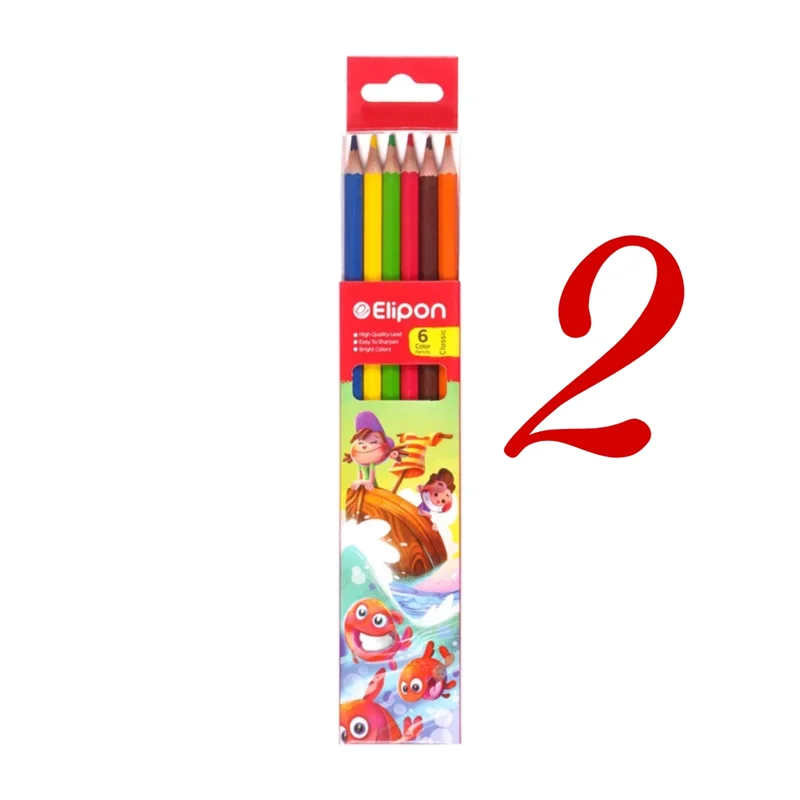 مداد رنگی 6 عددی برند الیپون رنگ های موجود در بسته بندی : قهوه ای - سبز-آبی - نارنجی-قرمز و زرد دارای کیفیت بالا - مقاومت شکنندگی بالا - رنگ های درخشان - تراش اسان